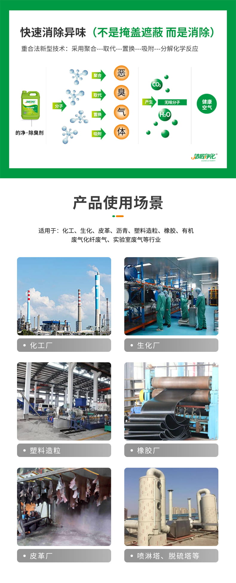 工業(yè)發(fā)展迅速,化工廠也在不斷發(fā)展,化工廠在生產過程中會產生大量的廢氣,比如氨、硫化氫、二氧化硫、甲硫氫、甲硫醇、甲硫醚、二甲二硫、二硫化碳和硫化氫等無機廢氣,還有VOC類:苯、甲苯、二甲苯、丙烯酸、醚類、脂類、醇類、酮類及苯乙烯等有機廢氣。不論有機廢氣還是無機廢氣,他們都有一個共同點,散發(fā)著較大異味?;U氣除臭劑可以能與各種有害、異味分子迅速發(fā)生聚合、取代、置換、吸附等化學反應,針對各種廢氣進行吸附,使原有污染氣體 異味分子結構發(fā)生改變,讓空氣變得清新。